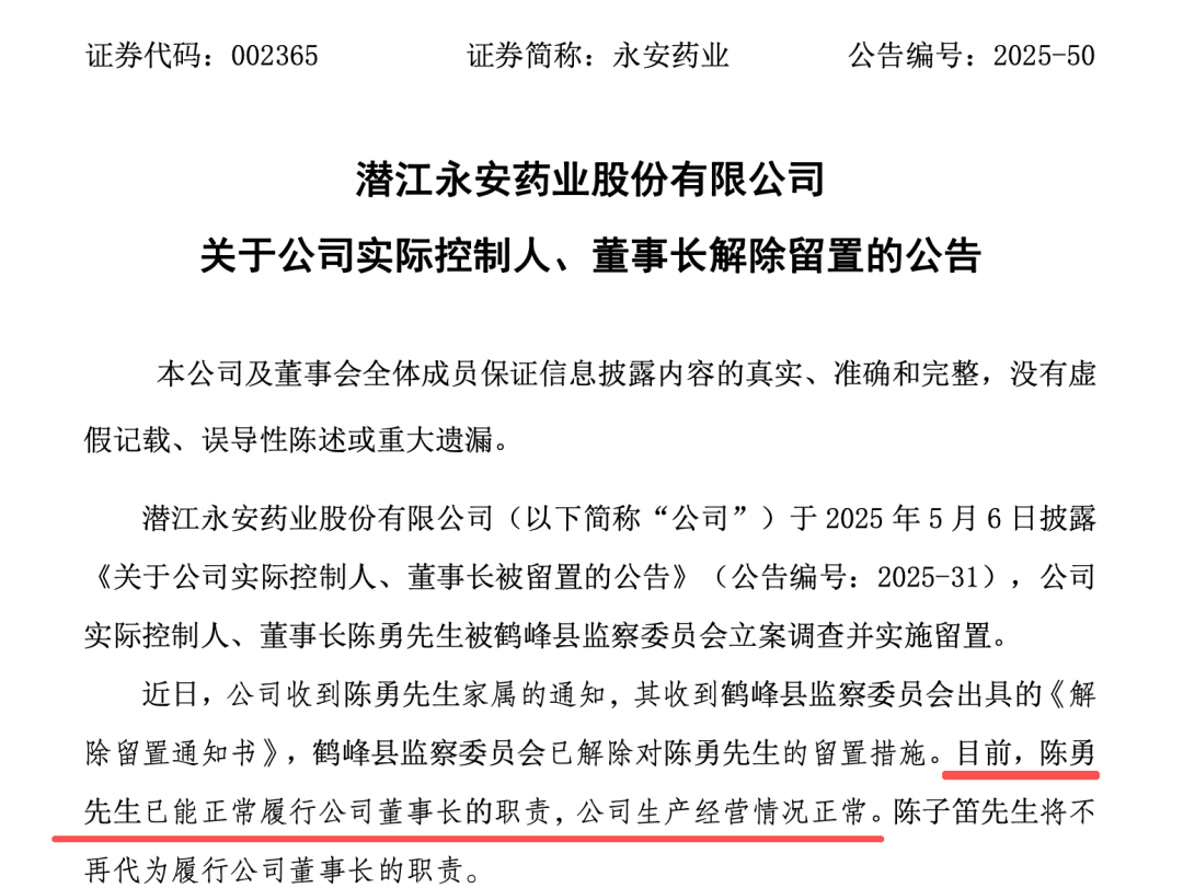 此前,2025年5月5日晚,永安药业曾公告,公司收到公司实质界限东谈主、董事长陈勇家属的示知,其于近日收到由鹤峰县监察委员会签发的对于陈勇的《立案示知书》和《留置示知书》,陈勇被立案拜谒并推论留置。当今,公司已对相关使命进行了妥善安排,公司坐蓐见解情况闲居,上述事项不会对公司日常见解活动产生要紧影响。