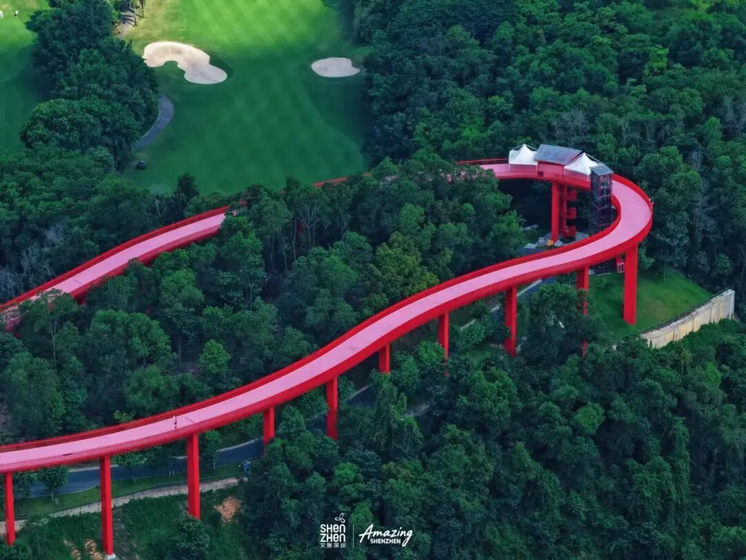 公园最引东说念主注探讨是一条全长约4公里的红色空中栈桥,被誉为“光明红丝带”,它弯曲于青翠的山林之间,将新城公园、虹桥公园本人以及大顶岭山林公园有机串联,酿成一派圆善的城市生态廊说念。